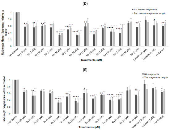 Out of the seven tested flavones, compounds 4b, 5a,b and 6a showed the highest antiangiogenic activities against the measured elements of angiogenesis. Compound 4b exhibited the strongest antiangiogenic activity at 10 µM with 60% inhibition of the number of junctions and total master segments length (p < 0.0001); 70% inhibition of number of master segments, number and total segments length (p < 0.0001); and 75% inhibition of number of meshes (p < 0.0001). The two 4-thio di-hydroxy derivatives (5a,b) also showed strong reduction in tubule formation, whereas the 7,8-dihydroxy 4′-bromo derivative (5a) showed slightly better activity (64% inhibition) than the 5,7-dihydroxy 4′-chloro analogue (5b) that resulted in 60% tube formation inhibition. At 1 µM concentration, derivative 6a showed the strongest activity (55% inhibition, p < 0.0001) among all tested compounds, which is comparable to the clinically used anticancer/antiangiogenic drug sunitinib (50% inhibition after 48 h) at the same concentration [43]. At 10 µM, compound 6a followed the trend of the other three mostly active compounds with 57% inhibition of all the measured tube formation elements.