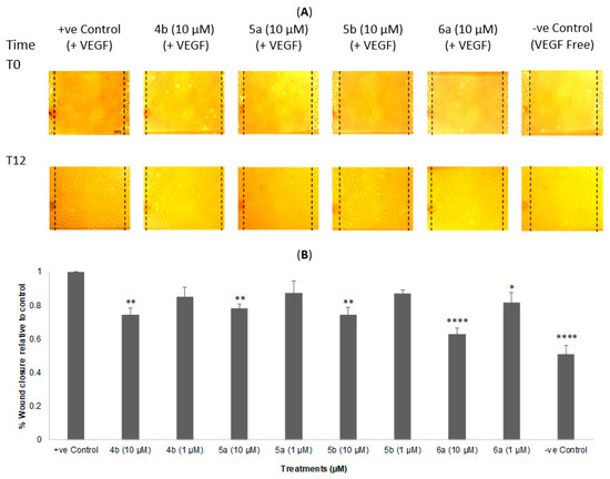 Following the reported method [12], HUVECs were seeded in 12-well plates at 3 × 104 cells/well and cultured until 80–90% confluency. Afterwards, they were serum starved (0.1% serum) for 24 h to inactivate the cell proliferation. A scratch was performed on the cell monolayers using a 200 µL pipette tip. Cells were then washed twice with PBS and treated with medium containing VEGF (10 ng/mL) and either 4b, 5a,b or 6a (at 10 µM or 1 µM). Images of the scratches were taken immediately after performing the scratch (t = 0 h) and at 12 h (t = 12 h). The area not covered by the cells was quantified using ImageJ software. The % of wound closure was calculated using the following equation:
