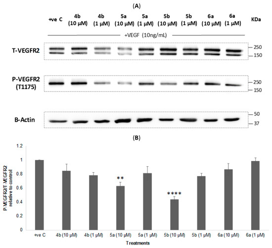 HUVECs were cultured in 6-well plates at 1 × 105 cells/well and cultured for 48 h. After 48 h, they were serum starved (0.1% serum) for 24 h to inhibit cell proliferation. Cells were then treated with complete medium or compounds 4b, 5a,b or 6a (at 10 µM or 1 µM) for 1 h followed by 30 min incubation with VEGF (10 ng/mL) to activate VEGFR2 phosphorylation. Afterwards, cells were washed twice with ice cold PBS and lysed using 100 µL radioimmunoprecipitation assay (RIPA) lysis buffer with 1% protease inhibitor and phosphatase inhibitor. The amount of protein present in the cell lysate was assessed using the DC (Bio-Rad) protein assay developed from Lowry’s protocol for protein assessment [60]. Protein lysates (15 µg) were separated by SDS-PAGE and then transferred to PVDF membranes. Membranes were blocked with 5% BSA in TBS-T buffer and then probed for PTyr−1175-VEGFR2 (1:1000) and actin (1:1000). Protein bands were detected by incubating with horseradish peroxidase-conjugated secondary antibodies (1:5000) and visualised with enhanced chemiluminescence reagent using ImageQuant LAS 4000 (GE Healthcare, Hatfield, UK). Next, PTyr−1175-VEGFR2 membranes were stripped from bound antibodies following Abcam protocol [61] and then re-probed for total VEGFR2 (1:1000). The density of bands was measured using ImageJ software. P-VEGFR2 was normalized to T-VEGFR2 and data were represented as a ratio to the positive control (VEGF enriched).