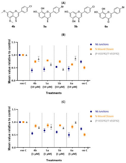 Comparison between tube formation (represented by nb junctions), scratch and Western blotting assay results of flavonoid derivatives (4b, 5a,b and 6a). (A) Chemical structures of 4a, 5a,b and 6a; (B) comparison of 10 µM concentration; (C) comparison of 1 µM concentration.