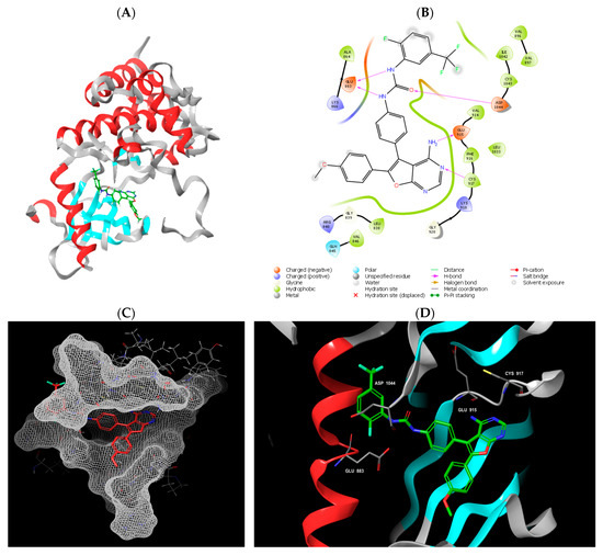 Docking of the original co-crystallized ligand (N-{4-[4-amino-6-(4-methoxyphenyl)furo[2,3-d]pyrimidin-5-yl]phenyl}-n’-[2-fluoro-5-(trifluoromethyl)phenyl]urea) with VEGFR2 (1YWN). (A) Ribbon representation showing ligand pose in chain A; (B) 2D interaction of ligand with binding pocket; (C) mesh representation of binding pocket surface interaction with ligand; (D) 3D interaction of ligand with binding pocket showing involved amino acids.