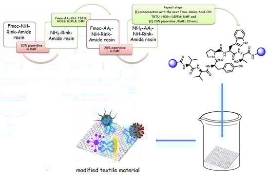 In recent years, more and more attention is paid to antimicrobial peptides in the fight against various pathogenic microorganisms: viruses, bacteria, fungi, and others. In 2020, the COVID-19 pandemic broke out, causing a total collapse in all areas of life. To cope with this pandemic, scientists around the world have begun to develop and test a huge number of compounds, both proven antiviral agents and new as yet undiscovered and potential antivirals. The world’s attention is focused not only on the new vaccines and drugs creation but also on the textile materials for the prevention and control of the invisible enemy, pathogens. The antimicrobial peptides are excellent candidate therapeutic agents that offer high selectivity and specificity, low levels of side effects, and toxicity. The peptides possess distinctive structures and functions by employing sophisticated mechanisms of action [1,2,3]. The great advantage of peptides against viruses consists in the reduced possibility of developing resistance during the treatment [4,5]. Peptides are expensive molecules, but they have some advantages over other kinds of molecules: they are made of natural moieties (α-amino acids), they are biodegradable, and they have negligible toxicity when exploited for external uses. Antimicrobial peptides efficiently inhibit many pathogens, including Gram-negative and Gram-positive bacteria and fungi. Additionally, some antimicrobial peptides have been shown to have anticancer or antiviral activity, such as indolicidin which has activity toward HIV [6]. Peptides can be relatively easily synthesized and modified by using standard synthetic protocols and solid-phase peptide (SPPS) methods. Most of the peptides contain a significant number of precisely located functional groups in their amino acid residues, which possess high-affinity and specific interactions with a target receptor, and they can play a role as ligands for them [7,8]. Peptide scaffolds allow the introduction of desired functional groups in their structure in order to increase biological activity or enhance other wished properties such as easier coating to textiles or other materials, for example, which may increase the possibilities for their application in biochemistry, medicine, and materials chemistry [9,10]. The presence of amino acid residues that have both aromatic moiety and hydrophobic nature, such as Trp, Phe, Tyr, favor the protein binding. According to the literature [11], the presence of free functional (-OH, -SH, -COOH, guanidine, etc.,) groups in the peptide molecules creates a more favorable environment for binding the compound to the cellulosic fibers of textile materials.