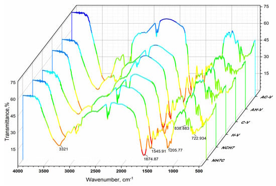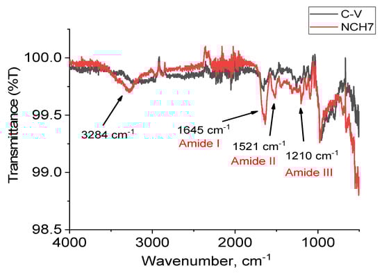 The study of the interaction between each peptide and cotton fabric has been performed by FTIR spectroscopy. The cellulose macromolecules can form hydrogen bonds with amide groups of peptides. As the quantity of peptides used for the cotton modification is small, the more informative are the obtained spectra by subtracting a reference spectrum of pure cotton from a spectrum of cotton fabric modified with each peptide. Figure 9 shows as an example the subtracting spectrum of the fabric sample modified with peptide C-V compared with cotton fabric modified with NCH7, as an example. In the subtracting spectrum of peptide NCH7, the band, due to N-H valence oscillations (νNH), appears with a maximum at 3284 cm−1 with small intensity, while in peptide C-V, this band is missing. The peptide NCH7 has a longer chain than peptide C-V and is probably part of amide groups not involved in hydrogen bond formation. Bands in the regions typical for Amide I, Amide II, and Amide III are also less intensive for peptide C-V. In peptide NCH7, these bands are more intensive because of free amide bonds, uninvolved in hydrogen bond formation. The spectra of the other samples are presented in the Supplementary Materials.
