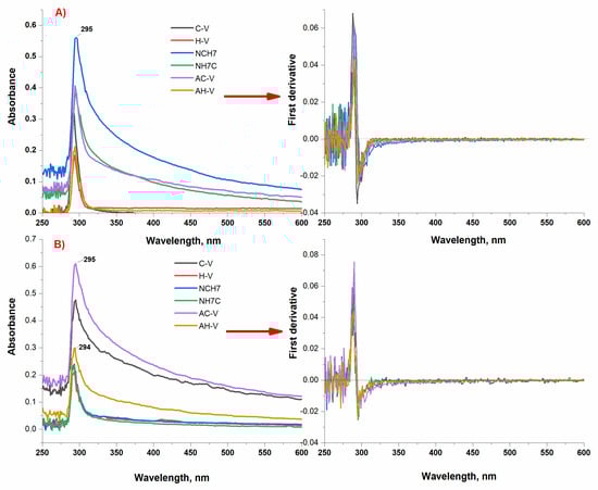 Zero order and first derivative UV-Vis spectrum of peptide derivatives at (A) pH 7 and (B) pH 9 at follow concentration of the compounds: 1.47 × 10−4 mol L−1 C-V; 9.80 × 10−5 mol L−1 AC-V; 8.90 × 10−5 mol L−1 NH7C; 8.81 × 10−5 mol L−1 AH-V; 1.02 × 10−4 mol L−1 H-V; 8.74 × 10−4 mol L−1 NCH7. Absorbance of all solutions were measured against d·H2O.