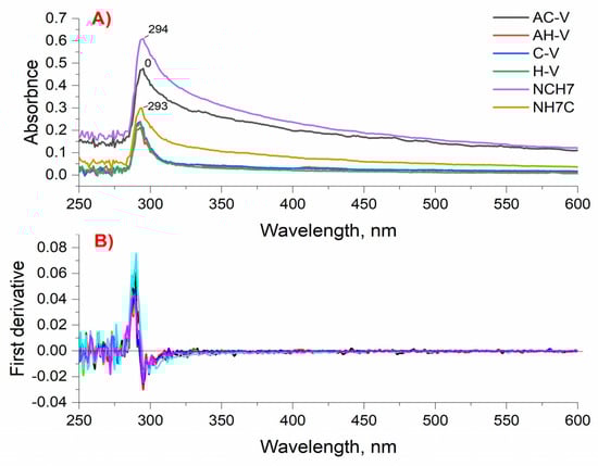 Zero order (A) and first derivative (B) UV-Vis spectrum of peptide derivatives at pH 3 and follow concentration of the compounds: 1.47 × 10−4 mol L−1 C-V; 9.80 × 10−5 mol L−1 AC-V; 8.90 × 10−5 mol L−1 NH7C; 8.81 × 10−5 mol L−1 AH-V; 1.02 × 10−4 mol L−1 H-V; 8.74 × 10−4 mol L−1 NCH7. Absorbance of the solution was measured against d·H2O.