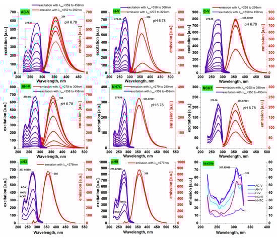 Standard solutions of the peptide compounds were prepared by dissolving the dry substance in water:methanol = 1:1 and the concentrations are as follows: 8.82 × 10−4 mol L−1 C-V; 7.84 × 10−4 mol L−1 AC-V; 7.12 × 10−4 mol L−1 NH7C; 7.05 × 10−4 mol L−1 AH-V; 8.16 × 10−4 mol L−1 H-V; 6.99 × 10−4 mol L−1 NCH7. UV-Vis and fluorescence spectra were measured in dilute solutions with concentrations: 1.47 × 10−4 mol L−1 C-V; 9.80 × 10−5 mol L−1 AC-V; 8.90 × 10−5 mol L−1 NH7C; 8.81 × 10−5 mol L−1 AH-V; 1.02 × 10−4 mol L−1 H-V; 8.74 × 10−4 mol L−1 NCH7. A series of solutions with the indicated concentrations were prepared at pH 10 (0.00013 mol L−1 NaOH) and pH 3 (0.0005 HCl mol L−1).