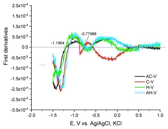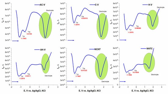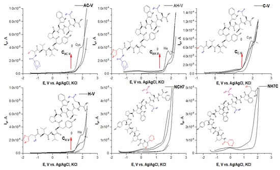 The electrochemical behavior of peptide compounds was also studied to evaluate their interaction with solid surfaces (e.g., the surface of a glass carbon electrode). The peptide compounds included as antimicrobial agents in textile materials are present in micro quantities, therefore it is necessary to apply hypersensitive methods for their detection and monitoring of their structural performance. The interaction of peptide derivatives with hard surfaces (e.g., electrode surface) is not only a fundamental phenomenon but also a key to several important and new applications of these compounds as biosensors for the detection of antimicrobial biomaterials. The peptide molecule is often complex in nature, with differences in characteristics such as solubility and charge, highly dependent on both naturally occurring amino acids and the exact amino acid sequence [51]. The main transfer of a compound to the solid surface of the electrode is by adsorption and diffusion, and it is often reported that hydrophobic surfaces adsorb more compounds with large molecules than hydrophilic ones [52,53]. The conformational state of the peptide molecule also plays a role in the electronic exchange between the electrode and the electroactive centers of the peptides, and usually, the inhibition of the electroactive groups reduces the possibility of transfer and blocks the electrochemical activity of the molecule. Such an orientation can also increase the distance between electroactive amino acids and electrodes and thus also increase the difficulty of electron transfer [54]. Direct electronic transfer of peptides and proteins has been reported to mainly involve compounds containing electroactive groups of amino acids such as tyrosine [55,56], tryptophan [57], and histidine [58], cysteine and methionine [55], oxidizable at carbon electrodes [59]. The oxidation process of tyrosine is associated with the formation of a thermodynamically unstable radical from the hydroxyl group attached to the benzene nucleus of the peptide structure. The desire to obtain a more stable radical structure leads to the formation of electroactive orthoquinone reducing reversibly to catechol by a two-electron-proton mechanism [53]. The oxidation of tryptophan takes place in two pH-dependent irreversible oxidation steps, as follows: (1) first oxidize the pyrrole ring and (2) indole electrochemical hydroxylation of the benzene moiety to form two electroactive products adsorbing on the electrode surface [56]. For the amino acid cysteine, three successive oxidation reactions on the GCE surface were observed involving the oxidation of the sulfhydryl group and the formation of a radical undergoing nucleophilic attack from water as a solvent to give an intermediate that oxidizes in the second step to cystic acid. The voltammetric behavior of the peptide compounds was studied in phosphatic buffer solution at pH 6.87 and 7.34 by differential pulse voltammetry. In a slightly acid medium, the production of an anode peak at the potential is proved −1.19 V by shifting to higher potentials, both with an increasing number of amino acid residues in the peptide molecule and with increasing pH of the medium. This could be associated with improved solubility, especially when the molecule is larger. What is striking is that the analytical signals characteristic of electroactive amino acids are detected, but significantly shifted at lower potential values despite their anodic oxidation (Figure 6). The peaks corresponding to the oxidation of tyrosine and tryptophan interact and partially overlap (Figure 6). By constructing the graphical dependence of the first derivative of the current data on the occurrence potential of the signals, a clear distinction and separation of the two peaks is achieved and the place of their occurrence is proved (Figure 7). However, it was found that at potentials around −1.19 the tyrosine part is oxidized, and at −0.600 the indole part of tryptophan (Figure 6 and Figure 7). It is felt that both the conformational state of the molecule and the functional groups of adjacent amino acid residues close to the electroactive groups affect the electron exchange and the degree of oxidation. At higher pH values, the appearance of both histidine and cysteine peaks in the compounds containing it is also observed (Figure 8). Moreover, up to a certain increase in the analyte concentration, a proportional increase in the intensity of the peak is observed, without shifting the place where it appears. This indicates a diffusion-controlled process with subsequent saturation of the electrode surface. It is noticed that in the case of long-chain peptides (NH7C and NCH7) the signals of the cysteine part are not registered, most likely due to the presence of spatial obstruction. The half-widths of the tyrosine and tryptophan peaks correspond to a quasireversible process with one proton and one electron exchange process with the electrode space.