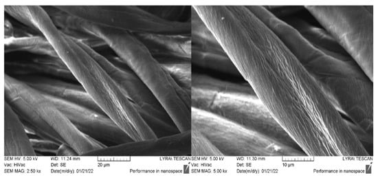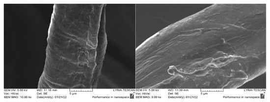 The morphology and the presence of peptide compounds on the surface of the cotton material are also characterized by SEM analysis. Figure 10 shows the micrographs of the untreated cotton fibers at different magnifications. It is well visible that the characteristic cotton fiber shape is of a flat twisted ribbon. The longitudinal arrangement of the cellulose microfibrils to the fiber axis is the reason for its rough surface [60]. After the material processing with new synthesize peptides, the typical structure of the fabrics is preserved, and the individual fibers are well visible. Figure 11 shows the cotton fabric treated with a short-chain peptide (AC-V) and a longer chain peptide (NCH7). Deposition of peptide AC-V on the surface of fibers leads to the formation of an uneven layer containing aggregates with irregular form (Figure 11A–D).
