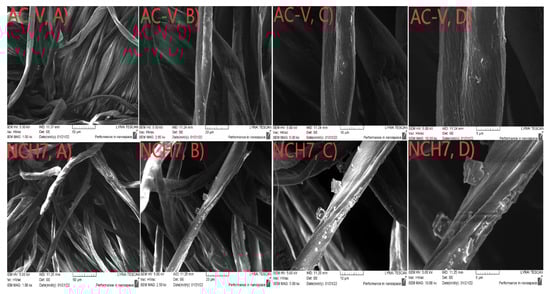 SEM images of cotton fabrics at different magnifications: treated by AC-V (40%) (from (A–D)): 50–5 µm) and NCH7 (40%) (from (A–D)): 50–5 µm).