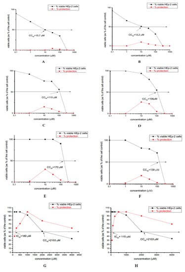 Antiviral activity curve (in red) and cytotoxicity curve (in black) of: (A) C-V; (B) H-V; (C) AC-V; (D) AH-V; (E) NH7C; (F) NCH7; (G) cytotoxicity and antiviral activity of ribavirin on the replication of HRSV in HEp-2 cells and (H) cytotoxicity and antiviral activity of ribavirin on the replication of HAdV-5 in HEp-2 cells.