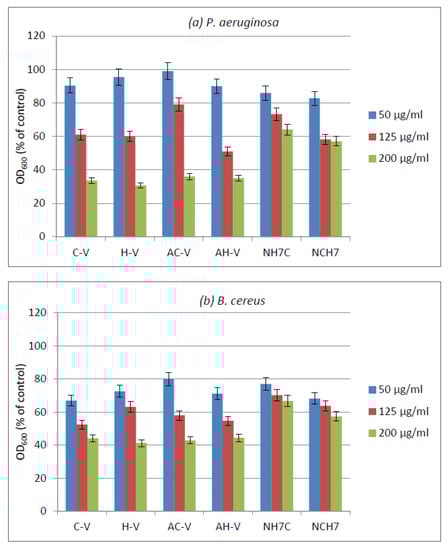 For this reason, the antimicrobial activity of the compounds was evaluated against both bacteria in a liquid medium. The results showed different activities of the compounds depending on their species and type of strains (Figure 14). Gram-positive B. subtilis was slightly more sensitive than Gram-negative P. aeruginosa which can be explained by the differences in the cell wall structures of Gram-positive and Gram-negative bacterial cells. At a concentration of the compounds 200 µg/mL, the samples C-V, H-V, AC-V, and AH-V have shown similar inhibition of the growth of P. aeruginosa (in the range 64–66%) followed by the samples NCH7 and NH7C (43% and 36% growth reduction, respectively) (Figure 14a). Against Gram-positive B. subtilis, a similar trend was observed at a concentration of 200 µg/mL with growth inhibition of 56–59% by C-V, H-V, AC-V, and AH-V samples, followed by NCH7 (43%) and NH7C (33%) samples (Figure 14b). At concentration 125 µg/mL, a similar better-pronounced trend was observed at both tested strains.