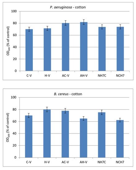 The antibacterial activity of cotton fabrics treated with 1% solutions of the compounds was investigated in MPB against the model B. cereus and P. aeruginosa strains. Test tubes with sterile MPB and square cotton specimens (10 mm × 10 mm) were inoculated with a cell suspension of each bacterial culture. Tubes with untreated cotton samples and without specimens were also prepared as controls. After 24 h incubation under shaking, the specimens were removed and OD600 was determined. The antimicrobial activity of the treated cotton samples was evaluated by the reduction of OD600 after incubation compared to the control sample. All assays were performed in triplicate and the average was taken (Sr < 5%).