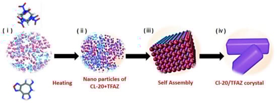 This is an innovative method recently introduced for solvent-induced self-assembly of (i) a single energetic crystal with a non-energetic coformer, and (ii) both energetic components for the synthesis of ECCs. This technique involves (i) crystal particles’ induction, (ii) the aggregation of particles in an organized orientation, (iii) the integration of particles’ surfaces, and (iv) the formation of the ECC. Since the impact of heat and mass transfer operations is only minor in this method, it has an inherent convenience in the scaled-up production of ECCs. For the purpose of reference, Figure 3 describes the whole process of the self-assembly synthesis protocol of ECCs. Moreover, the details of all the synthesis methods are depicted in Table 1.