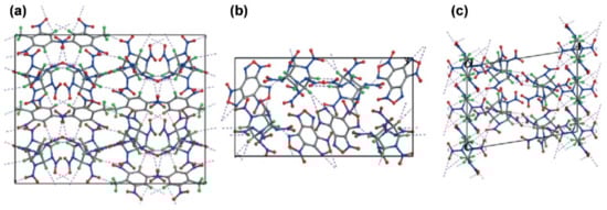 (a) CH···O hydrogen-bonding interactions. (b) CH···N hydrogen-bonding interactions. (c) NO2−π interactions. Reproduced from [56]. Copyright 2019, American Chemical Society.
