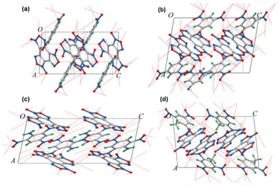 The intermolecular hydrogen bond and N—O⋯NO2 type interactions between BTF and DNB, TNB, TNA, and TNB molecules in cocrystals. (a) BTF/DNB cocrystal, (b) BTF/TNB cocrystal, (c) BTF/TNA, and (d) BTF/TNT, respectively. The lengths of H⋯N, H⋯O, and O⋯N contacts are presented in red dashed lines. Reproduced from reference [61]. Copyright 2015, The Royal Society of Chemistry).