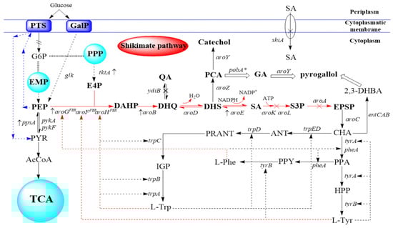 The SA pathway is an intermediary metabolic pathway, which is acknowledged as the basis for the generation of aromatic amino acids and their derivatives in plants and microorganisms, and SA is the intermediate of this pathway. Although the SA pathway has been extensively studied in E. coli, metabolic modifications of the pathway have only limitedly improved SA yield. On one hand, this pathway relies on the glycolysis pathway [24] and phosphopentose pathway (PPP) [25] to provide two starting substrates, including phosphoenol pyruvate (PEP) and erythrose-4-phosphate (E4P), respectively. On the other hand, this pathway includes many branching pathways (Figure 1), which need to be blocked to orient the carbon flow to SA.