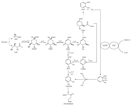 The P. aeruginosa PAO1 strain can use ANT as a carbon and energy source [97]. This strain contains specific enzymes that can convert ANT into catechol through o-dihydroxylation, spontaneous deamination, and decarboxylation. Thus, as shown in Figure 4, amplifying the metabolic network of catechol in E. coli by metabolic engineering can be employed as another strategy for catechol production [21].