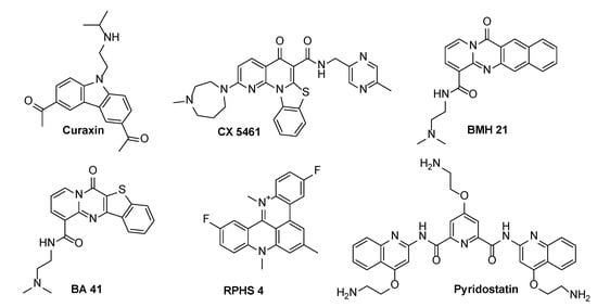 Curaxin CBL0137 (Figure 1) belongs to a class of substituted carbazoles exerting anticancer activity by complex and diverse mechanisms. Recent findings have claimed the involvement of DNA binding in the curaxin antitumor activity [23,24]. The NMR studies by our group evidenced a significant binding of curaxin with the single repeat sequence of human telomeres (TTAGGGT)4 and with Pu22T14T23, a model of the c-myc promoter Pu22 sequence [25]. Investigations of BMH21, BA41 and CX-5461 (Figure 1), [26] provided evidence that these compounds are also effective binders of the human telomeric and oncogene promoter G-quadruplexes, such as c-MYC and c-KYT.