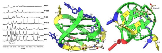 The titration of TP3-T6 with the curaxin displayed the broadening of the selected 1H imino proton signals, even at low ratio (R = (curaxin)/(TP3-T6) = 0.5). Specifically, the residues belonging to the 3′-end tetrad of the G-quadruplex G5, G9, G17 and G23 essentially disappeared at R = 1.0 (Figure 3). This behavior suggested that the curaxin mainly interacts with the 3′-end tetrad.