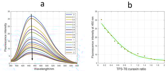 (a) Fluorescence spectra recorded along the titration of curaxin with TP3-T6; (b) Experimental (red symbols) and calculated (green line) fluorescence intensity at 450 nm for the titration of curaxin at different concentrations of TP3-T6. Conditions: 20 mM phosphate buffer (pH 7.1), 70 mM KCl of 3 μM curaxin and increasing amounts of 69 μM of TP3-T6. Excitation wavelength 334 nm.