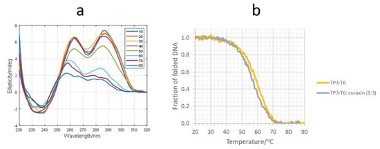 (a) Selected CD spectra recorded along the melting of the TP3-T6/curaxin 1:3 mixture. The whole data set is given in Supplementary Materials; (b) Fraction of folded DNA vs. temperature calculated from the melting of TP3-T6 and of the TP3-T6/curaxin 1:3 mixture at 265 nm. DNA and ligand concentration were 2 and 6 μM, respectively, 20 mM phosphate buffer (pH 7.1), 70 mM KCl.
