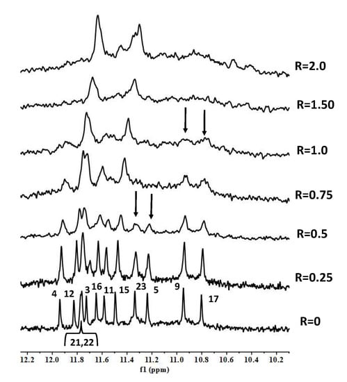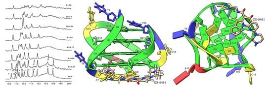 Concerning the titration experiments with RHPS4, we observed the broadening of selected 1H imino proton signals at a very low ratio (R = 0.25). In particular G3, G12, G15 and G21, all belonging to the 5′-terminal end tetrad, became very broad, until they almost completely disappeared at R = 1.0. However, not very well-defined signals were detected again at R = 2.0 (Figure 10). A molecular docking investigation did not allow to obtain an unambiguous model of interaction of RHPS4 with the oligonucleotide.