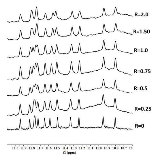 Imino proton region of 1D NMR titration spectra of TP3-T6 with BMH21 at 25 °C at different R = (drug)/(DNA) ratios.