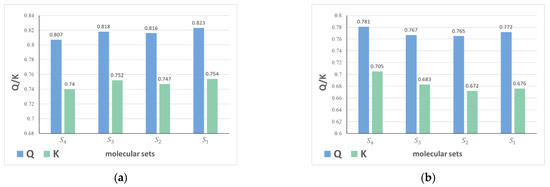 Comparing all results from different molecular sets, the highest Q value, 0.862, is achieved in molecular set S1. The highest kappa coefficient, 0.81, is obtained in molecular set S3. For the overall results in the five tables, better classification results appear more frequently in molecular set S1 and S4. The results from data with Mordred descriptors and Morgan fingerprints processed by RF method are shown in Figure 1, with (a) classification performance on Mordred descriptor set and (b) classification performance on Morgan fingerprint set. When the descriptor set is Mordred descriptors, it can be observed that the highest Q value is obtained based on S1, and same is true for the largest kappa coefficient. When Morgan fingerprints serve as the descriptor set, RF method performs better on S4 with the fewest number of drug molecules, as shown in Figure 1.