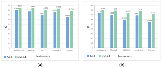 Classification results based on molecular set S4. (a) Q values; (b) Kappa coefficient.