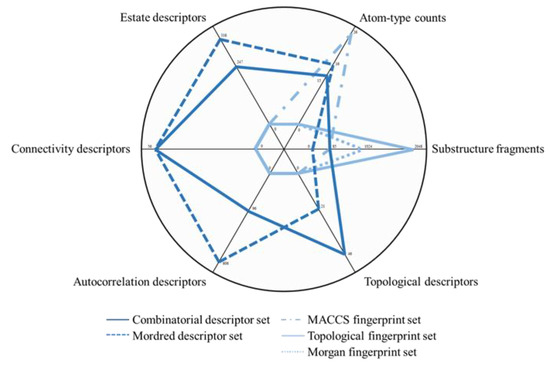 Comparing three descriptor sets with only binary value, i.e., MACCS, topological, and Morgan fingerprint data, the results obtained by combinatorial and Mordred descriptors are better, which is attributed to different representation of molecular structure. As shown in Figure 3, there are distinct differences between the two descriptor sets and the other three fingerprint sets in terms of six major types of descriptor groups. The three fingerprint sets are calculated by different principles but all come from digital transformation of molecular one-dimensional structure information, such as substructure fragments. In contrast, the two types of descriptor data composed of real numbers not only contain one-dimensional structure information but also include two-dimensional information, such as topological and connectivity descriptors.