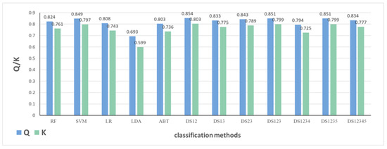 According to results in Table A2, Table A3, Table A4, Table A5 and Table A6 of the Appendix A, the fusion method obtained by RF and SVM performs better than single classifiers and other fusion models. The implementation principles and types of fusion methods are introduced in Section 3.2.2. The classification results by five single classifiers and seven fusion methods based on combinatorial descriptor data from molecular set S4 are displayed in Figure 4. The Q value and kappa coefficient are represented by different colored bars in the graph. Comparing all results by single classifiers, it can be found that better classification performance is achieved through SVM. In particular, classification performance obtained by LDA is far poorer than that of other classifiers, indicating that the correlation is not a simple linear relationship. Comparing carefully all fusion results, it can be observed that the DS12 method, fusing RF and SVM, performs better than other fusion methods and outperforms individual SVM. However, there are four fusion methods whose results are not better than that of single SVM, such as the fusion method based on SVM and LR, by which the obtained Q value and kappa coefficient are both lower than SVM by nearly 0.01.