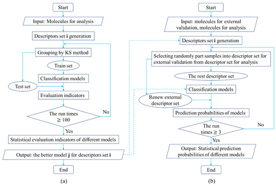 An example for model selection is obtained by randomly choosing a molecular set and a descriptor set from the first two columns of Table A1. Their combination with all the classification models in the third column of Table A1 is used to implement classification procedures as shown in Figure 6a. The molecular set is input for calculating the descriptors set. The calculated descriptor set is grouped into training set and test set by KS method. The training set is used to tune parameters of the classification algorithms and fit classification models. Then, the test set is classified by fitted models, and their results are evaluated and saved. This process, from grouping to evaluation, is run 100 times to obtain a statistical average result from different models. By comparing classification indicators, the better model based on chosen molecular set and descriptor set will be discovered. In this way, the better models for each combination of molecular set and descriptor set are selected to identify the molecules of the external validation set.