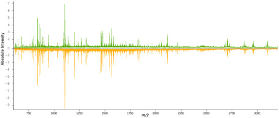 After tryptic digestion, the proteomic content of the samples was measured. From the overview of the spectral data of both classes (Figure 2), it was possible to see variations in the molecular compositions of both classes. The data from the individual spectra were then used for the training and validation of classification models.