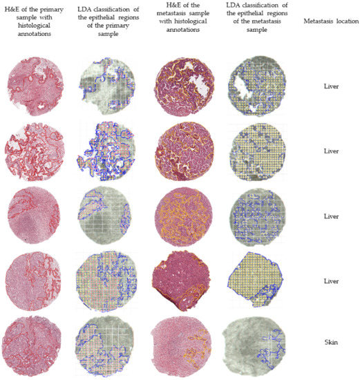 In order to further evaluate the external validation, we mapped the outcome of the classification of five matched pairs of primary and metastatic tumors, meaning that the samples were collected from the same patient. Figure 3 summarizes the outcomes of the external validation using the LDA model.