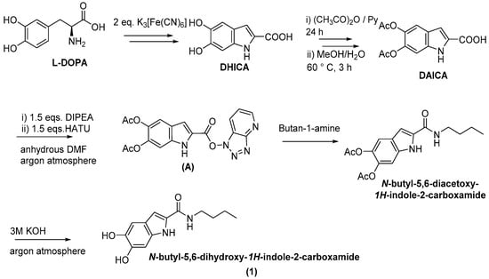 In our initial experiments the synthesis of DHICA butanamide was attempted using EDC, HOBt, and triethylamine (TEA) in dry DMF, at room temperature for 18 h under controlled atmosphere according to a protocol reported in literature to prepare caffeic acid amides that required prior acetylation of the catechol functionality [33]. 5,6-Diacetoxyindole-2-carboxylic acid (DAICA) was therefore prepared by acetic anhydride/pyridine (Py) treatment overnight followed by 1:1 v/v methanol/water under reflux to hydrolyse the mixed anhydride formed at the carboxyl group. HPLC analysis of the reaction mixture after amidation revealed partial conversion of the starting product to another component that did not show the molecular ion peak expected for the amide on LC/MS analysis. This latter analysis also showed substantial formation of the N-acetyl butylamine likely arising from displacement of the acetyl group from the catechol function of DAICA by the amino group.