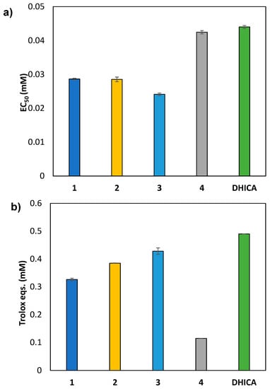 After deprotection of the catechol group, the antioxidant potential of the carboxamides was evaluated by two widely used chemical tests, namely the 2,2-diphenyl-1-picrylhydrazyl (DPPH) assay measuring the H-donor ability of a given species, and the ferric reducing antioxidant power (FRAP) test as a measure of the Fe (III) reducing power. Figure 2a shows data obtained in the DPPH assay expressed as EC50 values. Compounds 1–3 showed higher antioxidant activity compared to DHICA, while compound 4 was substantially comparable. Figure 2b shows data obtained in the FRAP assay expressed as Trolox eqs.