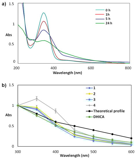 Shown in Figure 3b is the absorbance over the UV–Vis spectrum obtained at 24 h for all the amides normalized against the absorbance at 300 nm. All of them show a profile similar to that of DHICA indicating that the pigments formed may indeed be taken as true melanins. Comparison with the monotonic profile expected for an ideal melanin pigment indicates higher absorbance in the UVA region for all the samples except for DHICA, as particularly evident for compound 4, exhibiting a significant absorption in the 350–450 nm region.