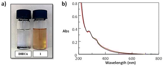 (a) Ethanolic solution (3 mg/mL) of the pigment from DHICA carboxybutanamide 1 (right) in comparison with DHICA melanin (left); (b) UV–Vis spectrum prior and after filtration of the ethanolic solution of the pigment from 1 (1 mg/mL).