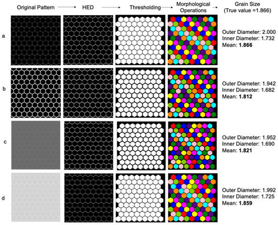 To analyze the effectiveness of the newly proposed grain size determination workflow, a series of tests with increasing complexity were carried out. To begin, a test on a computer-generated honeycomb structure representing an ideal polycrystalline cross-section was executed. The HED, thresholding, morphological operations, and grain size determination processed each image as discussed above (Figure 1c). By using a standard hexagon, the diameter is definitive, with no interpretation or error needed from a standardized method such as Heyn’s or Saltykov’s. The side length of each hexagon was normalized to 1 arbitrary unit, defining the minimum and maximum diameters as 1.732 and 2.000 units, respectively. The resulting mean diameter is 1.866 units. The algorithm reconstructs side lengths from a measured area using Equations (2) and (3). The algorithm results are shown in Figure 3 with images at each processing step. An optimal construct (Figure 3a) and an accurate pixel-to-micrometer ratio result in accurate diameter determination with essentially no error. As expected, thickening the hexagon borders (Figure 3b) decreases grain area and a smaller resulting diameter. The case for underexposed and overexposed micrographs was simulated using Figure 3c,d, respectively. It was found that the HED allows for edge detection at a range of luminosities, although high-intensity, low-contrast images perform marginally better than equivalent images at a low intensity.