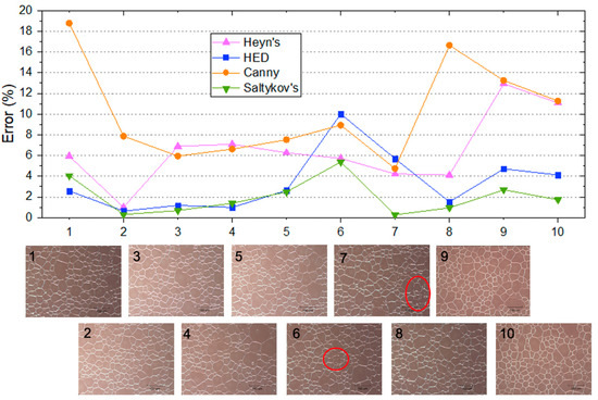 Moreover, considering the method comparison presented in Figure 4, it is clear that the HED method has a lower error than Heyn’s method for most samples; as such, if the ten randomly placed lines in Heyn’s are taken as a sufficiently accurate measurement of the mean grain diameter, the HED method can certainly be considered a viable and preferred alternative.