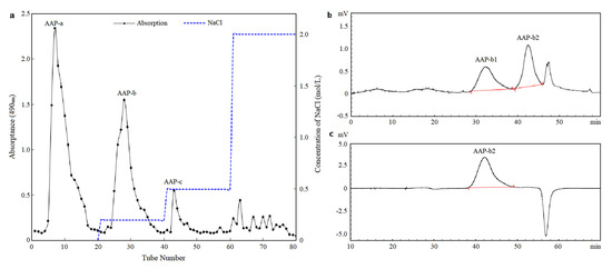 The average molecular weight of AAP-b2 was determined using high-performance gel permeation chromatography (LC-10A, Shimadzu, Kyoto, Japan) with a refractive index detector (RID-20A). Three gel chromatography columns, BRT105, BRT104 and BRT102 (Φ 8.0 mm × 300 mm), were connected in series. Sodium chloride (0.05 mol/L) was used as the mobile phase and the flow rate was 0.6 mL/min. Commercial dextrans with molecular weights ranging from 1.15 kDa to 409.8 kDa were chosen as standard polysaccharides to prepare the calibration curve, and the average molecular weight of AAP-b2 was calculated using its retention time.