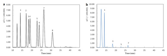 HPLC chromatograms of monosaccharide standards (a) and AAP-b2 (b). Peaks 1–8 represent mannose, rhamnose, glucuronic acid, galacturonic acid, glucose, galactose, xylose and fucose, respectively.