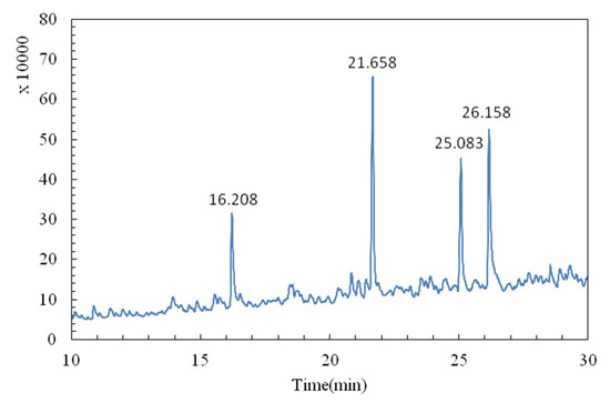 The glycosidic bonds in polysaccharides were investigated via methylation analysis. AAP-b2 was fully methylated and the GC-MS chromatogram showed four peaks of partially methylated alditol acetates (Figure 3). Through comparison with the CCRC spectral database, →3)-Manp-(1→, →2,3)-Manp-(1→, →4)-Glcp-(1→ and Manp-(1→ were identified. The molar ratio of these four types of glycosidic bonds was 2.1:2.0:1.5:1.0, and the mass spectra of PMAAs are presented in Figure S1.