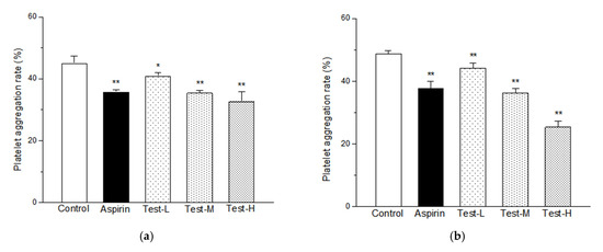 The effects of AAP-b2 on ADP- (a) and collagen-induced (b) platelet aggregation in vitro. * p < 0.05 and ** p < 0.01 compared to the ADP or collagen control groups.