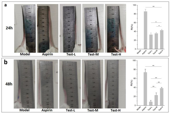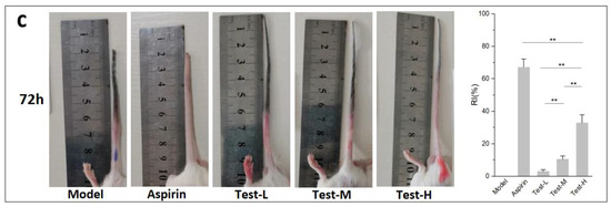 Carrageenan is a commonly used inducer of thrombosis. After intraperitoneal injection of carrageenan, thrombosis occurs in a mouse’s tail, and this change is visible and easy to measure. As shown in Figure 6, the mice tails turned black from the tip after modeling, indicating the formation of thrombi within the blood vessels of the tails. The black tail length became larger and the boundary of the thrombus in mice tails became clearer with the extension of time (from 24 h to 72 h). After 72 h, some mice tails even broke off due to the thrombosis (Figure 6c). The black tail length of each treatment group at 24 h, 48 h and 72 h after modeling was determined to calculate the inhibition rate of the thrombus relative length (IR), respectively. It could be found that AAP-b2 inhibited the thrombosis in mice tails and the effect presented a significant dose-dependent manner after 48 h (p < 0.01). The IR of high-dose AAP-b2 in our study was as high as 42.86 ± 1.97%, which was superior to the results reported for bioactive substances with antithrombotic activity, such as the extracts of Rehmanniae radix [25], Pseudocedrela kotschyi and Adenia cissampeloides [26].