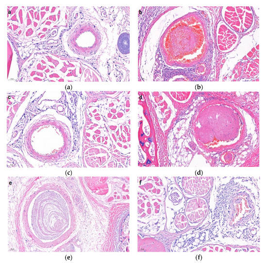Effects of AAP-b2 on the histomorphology of tail tissues in thrombosis model mice. (a) Control group, (b) model group, (c) aspirin group, (d) Test-L group, (e) Test-M group, (f) Test-H group.