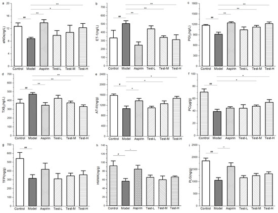 Effects of AAP-b2 on nitric oxide synthases (eNOs) (a), endothelin-1 (ET-1) (b), prostacyclin (PGI2) (c), thromboxane B2 (TXB2) (d), antithrombin III (AT-III) (e), protein C (PC) (f), tissue factor pathway inhibitor (TFPI) (g), high molecular weight kininogen (HMWK) (h) and plasminogen (PLG) (i) in thrombosis model mice. # p < 0.05 and ## p < 0.01 vs. control group. * p < 0.05 and ** p < 0.01 vs. model group.