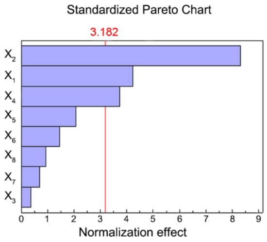 F-test analysis was introduced, proving that the above model was significant (p < 0.05). By regression analysis, the importance of each investigation factor in the process of UAE was found to be X2 > X1 > X4 > X5 > X6 > X8 > X7 > X3, in which X2, X1, and X4 were significant items (p < 0.05) (Table A1). A Pareto plot also reflected that the variables X2, X1, and X4 were the three factors most affecting the extraction yield of JMBF (Figure 2). In summary, extraction temperature (X2), ethanol concentration (X1), and ultrasonic power (X4) were selected for further optimization.