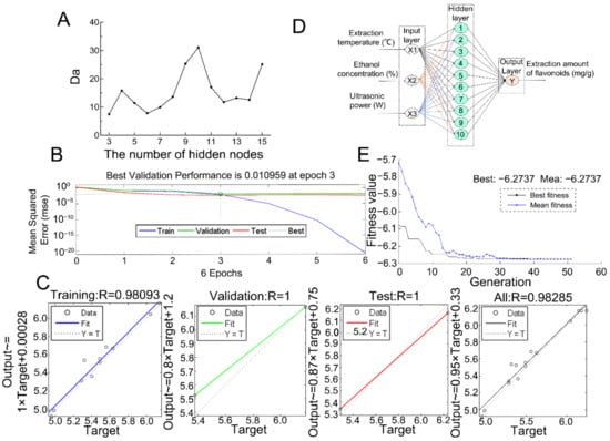 Furthermore, feedforward ANN backpropagation was adopted for the dynamic modeling of the extraction process using MATLAB software (MATLAB R2009a, MathWorks Inc., Natick, MA, USA), which was composed of multiple interconnected artificial neurons and grouped to form three basic units, namely, input layer, hidden layer, and output layer [38]. Among them, 11 samples were used for training, two samples were used for validation, and two samples were used for testing. In the present work, the ANN was trained using the Levenberg–Marquardt backpropagation algorithm. Considering that the number of hidden nodes has a serious impact on the performance of the ANN model, the degree of approximation (Da) was introduced to screen the best value of this number according to the literature method [39]. The calculation formula of Da was as follows: