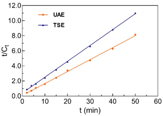 The relationship of t/Ct vs. t from batch experimental extraction data of UAE and TSE.